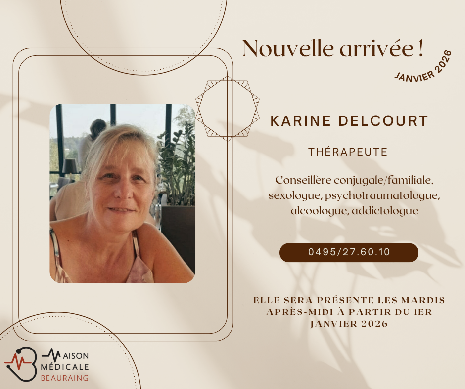 Pour toute demande dβinformation ou prise de rendez-vous, nβhΓ©sitez pas Γ contacter Mme Delcourt au 0495/27.60.10