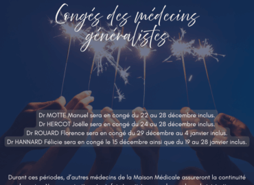 Chers patients, Vous trouverez ci-dessous les dates de congés des Médecins Généralistes pour cette fin d’année. Pendant leur absence, d’autres […]